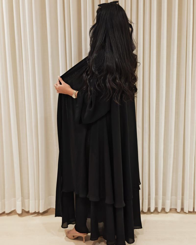- التصميم: قصة كلوش واسعة بطبقتين (طبقة سفلية وأخرى علوية)، تمنح العباية كثافة أنيقة وحركة متموجة جذابة دون أن تكون ثقيلة.