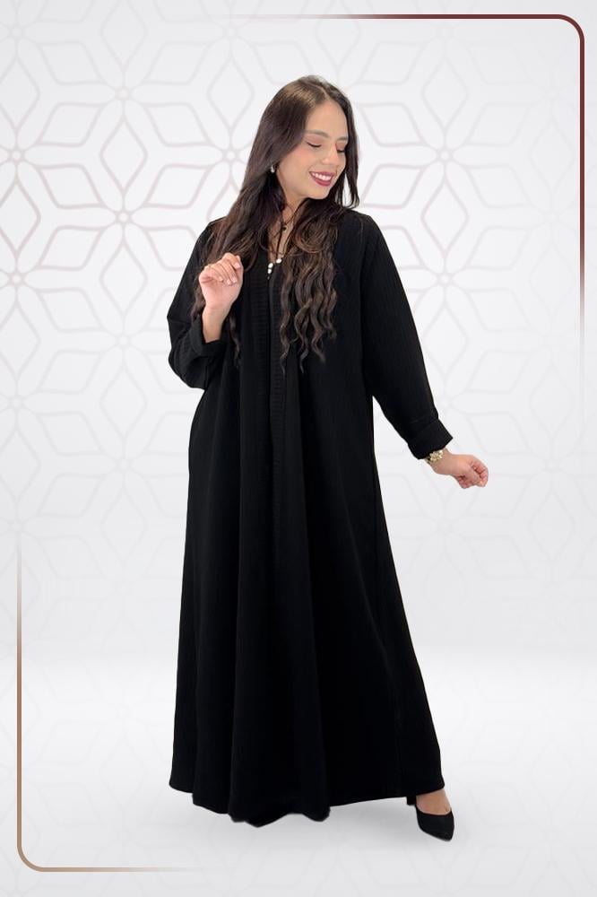 - الإضافات: الخياطة الدقيقة واللمسات الفاخرة تضفي على العباية طابعاً عصريًا وفخمًا.