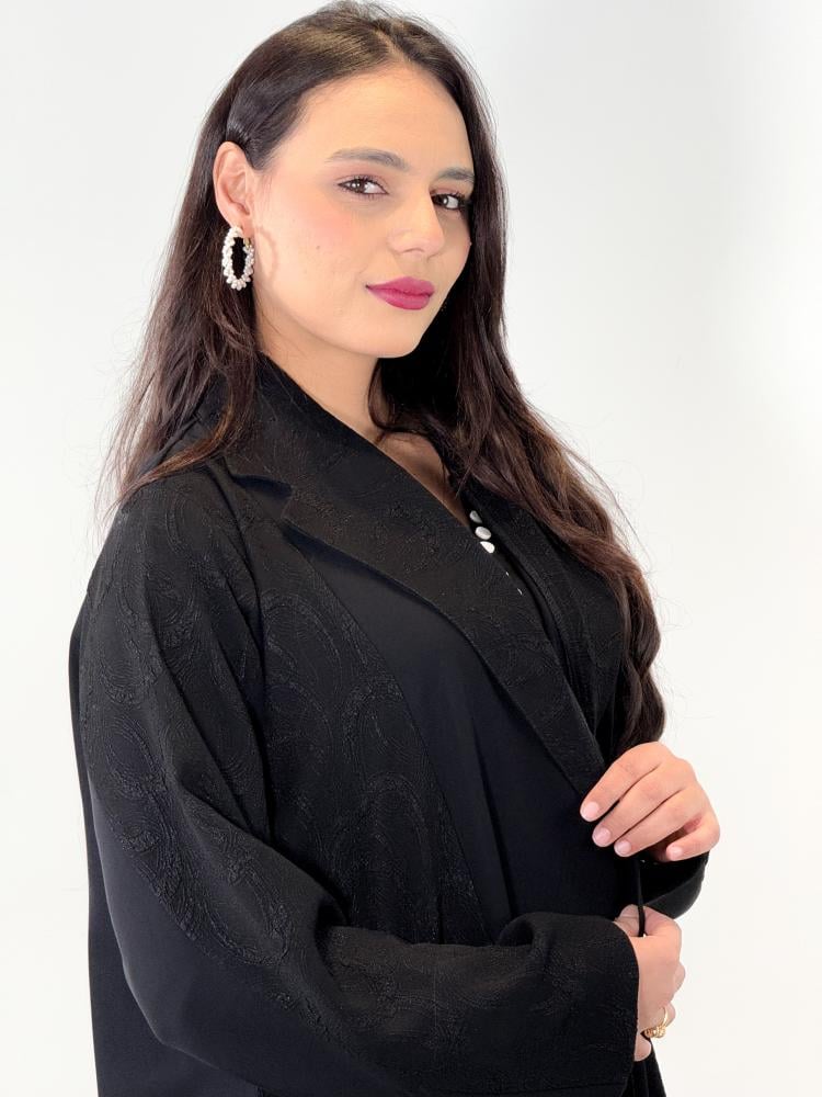 عباية نص كلوش مصممة من قماش إنترنت فاخر مع تدخيلة جاكار مما يضيف لمسة من الفخامة والجمال. تأتي مع بياقة مميزة وتطريز أسود في أسود على الأطراف ما يجعلها أنيقة وعصرية في الوقت نفسه القماش المرن والمريح يضمن لكِ الراحة طوال اليوم مما يجعلها مثالية للمناسبات الرسمية واليومية.